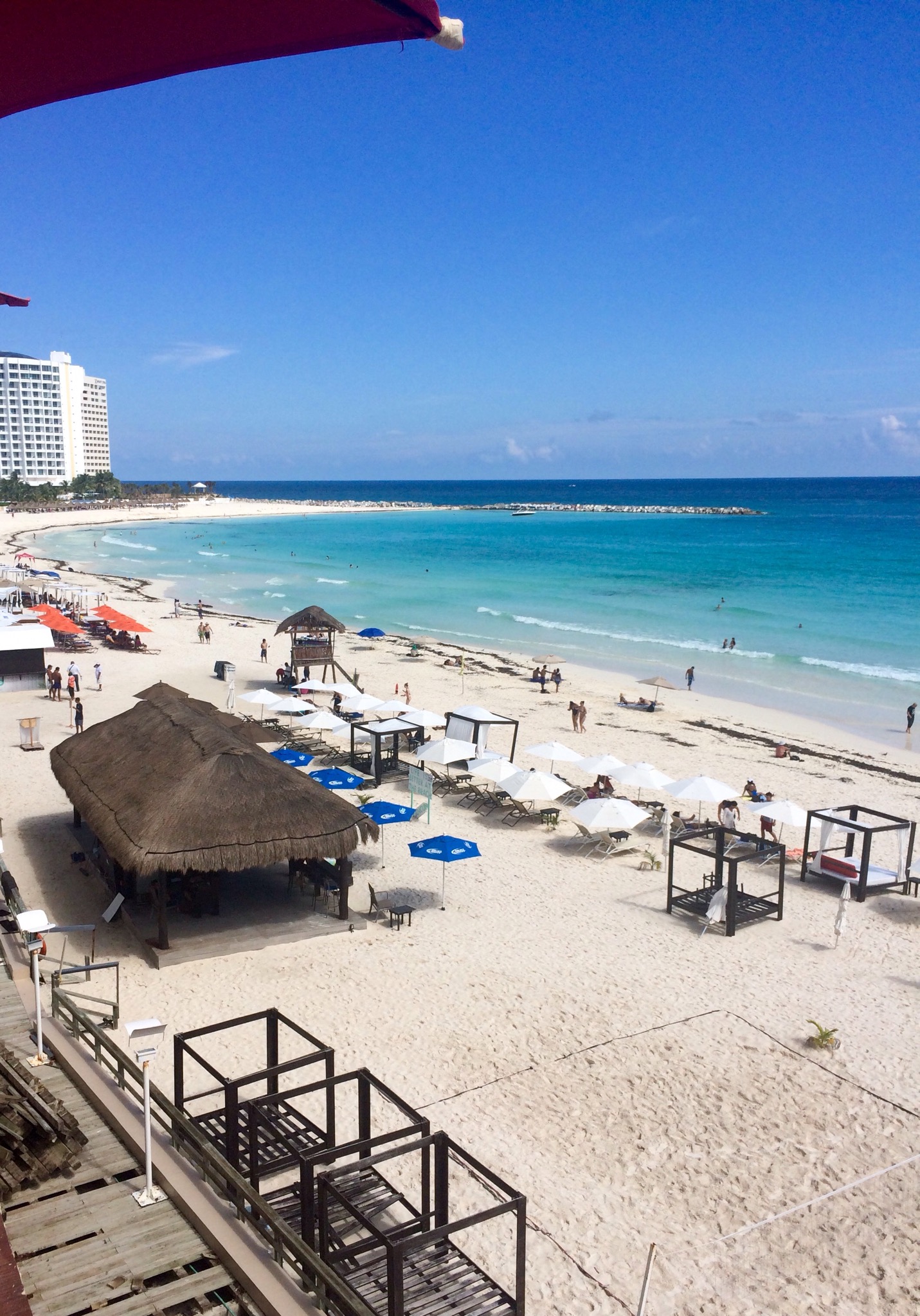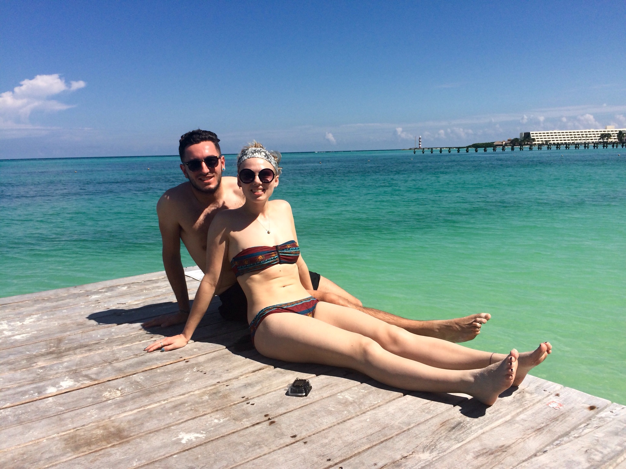 After this we caught the local R2 bus from the main road up to Zona Hotelera and made our way onto the beach via the public access spot at km 9. As most of the beach is only accessible via hotels we decided this was the best way and then we turned up the beach and managed to occupy a couple of sun beds strictly for hotel guests. It was a great spot right in front of the Hotel Riu Cancun. Calm, clear blue sea, white sand and a few small piers made for a great spot to start with those tans we both desired.