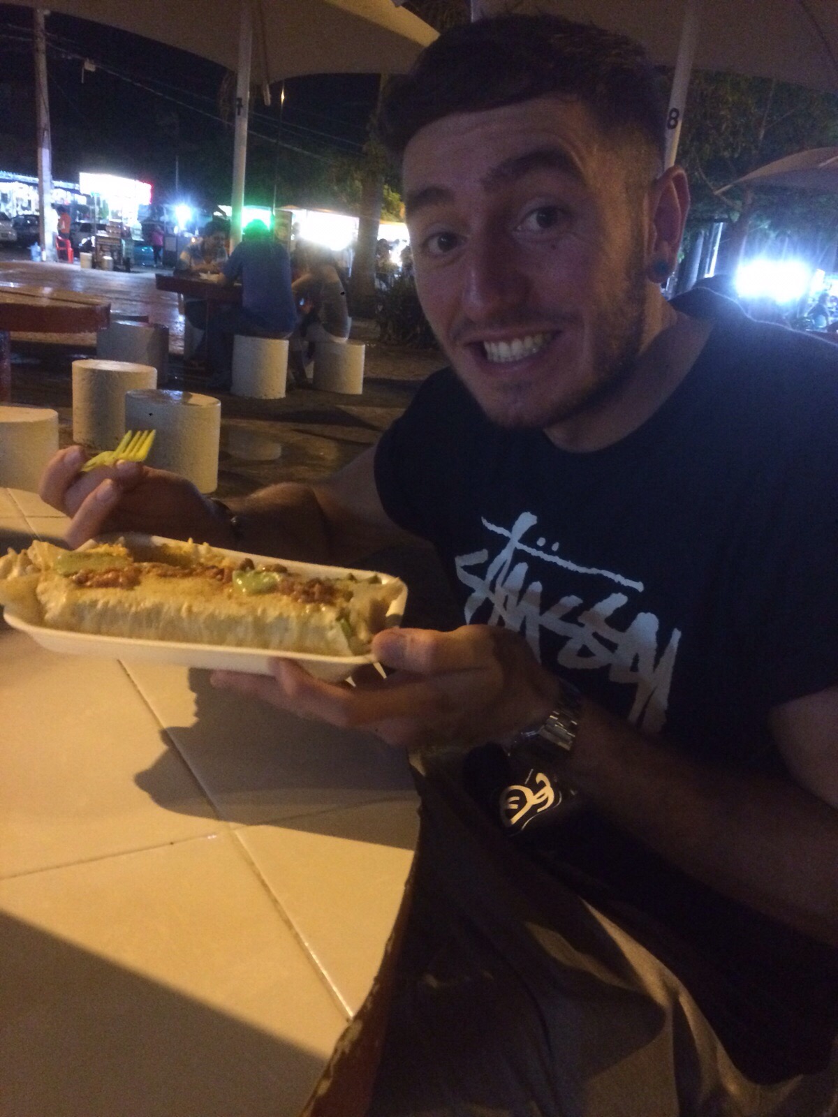 We jumped at the chance to finally get clean after the tedious 10 hour plane journey and felt better straight away. We changed into clean clothes and headed out for a walk around but by this time it had gone dark so we decided to get some food. Jonny obviously wanted Mexican, something spicy and authentic, Hayley, not so much. We headed up to Avenue Tulum and spotted the local ADO bus station we would need when we moved on from Cancun and after being pestered by the local restaurant owners we stumbled across Parque de la Palapas, a relatively small town square surrounded by churro/fruit carts on one side and a small row of local eateries on the other. These came equipped with a few circular stone tables and stools to sit at after ordering from one of the openings. Jonny ordered a Burrito, covered it in hot sauce, beans, salad and a water for Hayley and tucked in; all this cost a whopping 40 Mexican pesos (M$40) or in our terms less than £2. As we ate a local sang some Mexican classics to the small crowd gathered there.