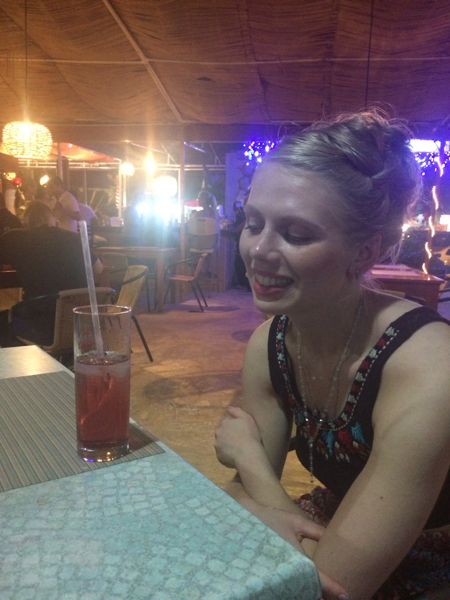 Hayley was hungry and fancied some seafood so we stopped at one of the restaurants Marinero’s where we both ordered fish, Salmon with creamy spinach sauce for Hayley and a white fish fillet smoothed in Yucatan spices known as Anchiote for Jonny. When they arrived they looked amazing and after the first mouthful we both looked at each other grinning, the best fish we’ve ever eaten, hands down. After the amazing meal we went back to the beach, this time using the public access spot at km 9.5 but found it wasn’t as nice here (and harder to get a hotel sun bed) so we reverted back to our original spot. The sun was just going down behind the hotel so we found a different pier to lie on and soaked up the last few hours of sunshine. We exited the beach through another hotels lobby, it was like another world inside there compared to where we were staying so before we got noticed headed out quickly. We jumped back on the R2 to downtown Cancun and after showers etc went to out for ‘a few’ drinks. The emphasis here on a few would lead you to believe, if we were the normal sort of young couple out in Cancun that we had many more than a few and ended up stumbling home in the early hours of the morning. However, this was not to be. We had one free drink in a new bar that definitely had zero alcohol content so moved straight onto the liveliest bar we could find. It was two for one cocktails so Jonny ordered two tequila sunrises, why not being in Mexico, Hayley ordered, yeah, you guessed it, a Vodka cranberry, why change the habit of a lifetime eh?! It gets better though, after 1/3 of the drink Hayley announced in between giggles that she was already drunk and needed to eat.