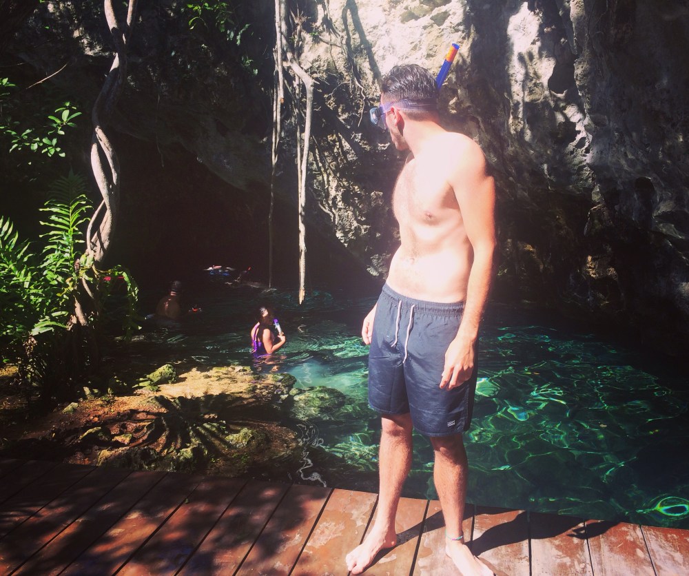 The next morning we awoke and headed to the bike rental shop and decided to visit the Grand Cenote that our amigo at the hotel had told us was the best around. After a quick stop at a pharmacy for eye drops for Jonny who seemed to have some sort of eye infection and the local supermarket for snorkels, we were off. A relatively short ride up the road and we had arrived at the Cenote. After paying the entrance fee of around £6 we entered and were instantly taken a back by the site in front of us. Opening up from literally a huge hole in the ground was the most beautiful array of plants, underwater caves and crystal clear waters.