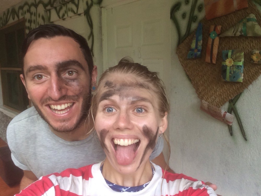 After 45 minutes, probably more, and many close calls of the van tipping over or losing control going down some of the major hills on the road, we made it to a bridge where we got out the back of the truck. Bruised, battered and all in some state of shock we trudged off down a dirt path towards our first stop, the caves. After clambering over/through waterfalls we made it to the reception area and got changed into swim wear and handed over our bags. Quickly we ascended up the side of the hill via a number of stairs and spotted the entrance to the caves. We were all handed a candlestick each and slowly and apprehensibly made our way into the darkness and the water. The temperature of the water was so low that it took our breath away as soon as it rose above our thighs. Wading further into the blackness, candles aloft above our heads we were intrigued as to what was to come. We reached a small opening we had to pass through one by one and as we did so the guides drew on our faces with mud from the walls, Hayley having cross on her cheeks and Jonny a pirate like patch over his eye. Directly after this the floor dropped away and it was no longer possible to walk so we had to swim, again still holding the candles above our heads not daring to let them go out and plunge ourselves into even more endless black. Soon we were again climbing and scrambling on the rocks, walls and obstacles in the way, Jonny having to hold Hayley’s candle on occasion so she could pass safely. After a few close calls and half an hour of ups, downs and throughs we were stopped by the guides, we had reached the waterfall. As mentioned, it had rained non stop all yesterday and had carried on throughout the night and into the morning. For this reason we could no longer climb up the waterfall as usual and carry on further but we could go underneath it and slide back to the group in a loop. This was achieved in fours, by climbing through a tiny hole and then under the pounding of the water from above, where it was impossible to even open your eyes and trust the guide that it was safe to lower yourself into the water below. First time it was scary but exhilarating so Jonny headed back with a few of the others for a second go. As this was the end of the road as such, we turned around and passed the other groups behind us waiting for their turn. The way back was very much filled with the same thing with one addition. We reached a ledge we had climbed up and were told we could jump off if we wanted. Not ones to pass up an opportunity we eagerly accepted. Hayley went first and sprung out into the black icy waters below and then Jonny followed suit. Candles re lit we made for the light streaming through the entrance and emerged back into the rain